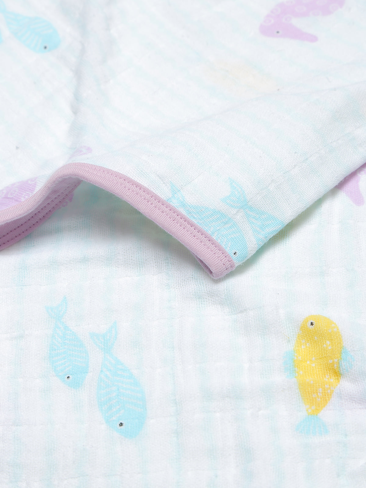 Each giftset contains one 100% premium cotton hooded towel and a set of three muslin washcloths. Towel available in 3 prints: Seahorse (in white with purple trim), Whale (in white with limegreen trim) & Seagul (in white with tangerine trim).